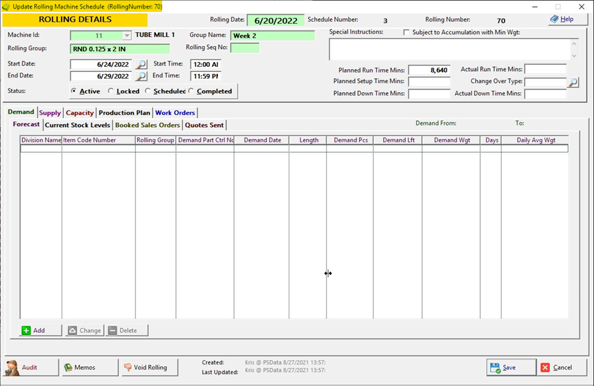 the schedule for each machine id for a period is set up depending on the production, the schedule can be set up