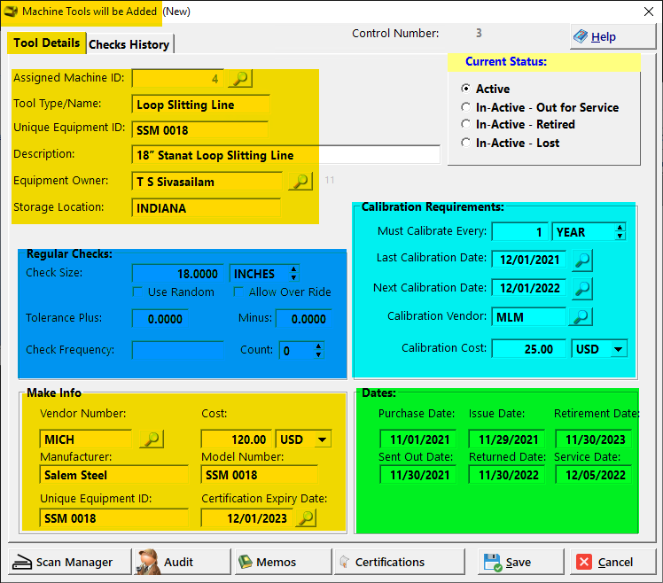 the tools can be in anyone of the status (Active, In-Active- Out for service, In-Active -Retired, In-Active-Lost)