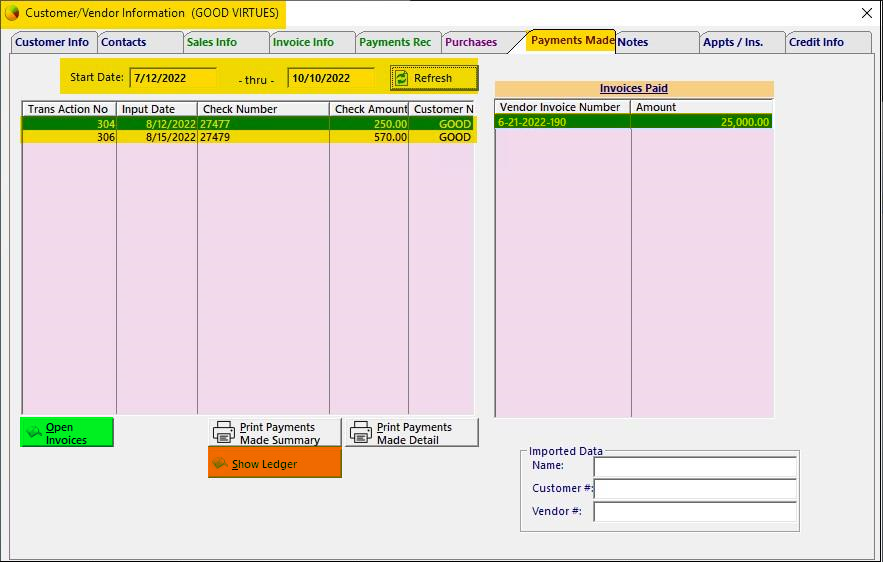 Payments Made Tab: The tab details payment made against supplies received with cheque number and vendor invoices.